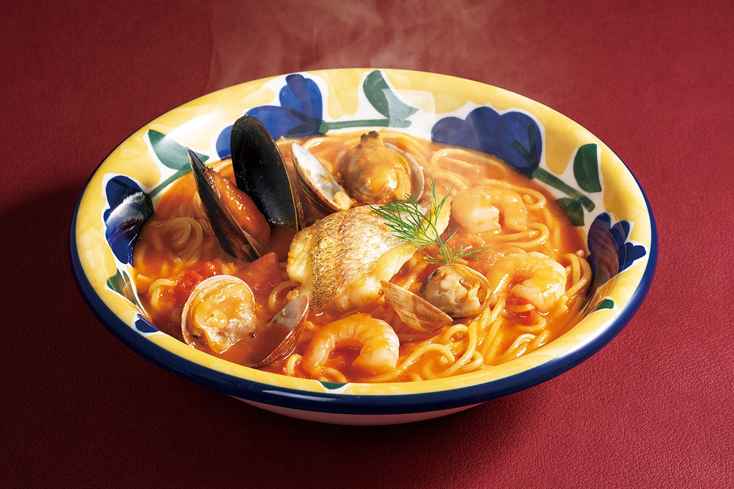オマール風味のトマトスープに、姫鯛やえび、ムール貝、あさりを惜しみなく合わせました。魚介の旨みたっぷりのスープパスタで、心も体も温まってください。