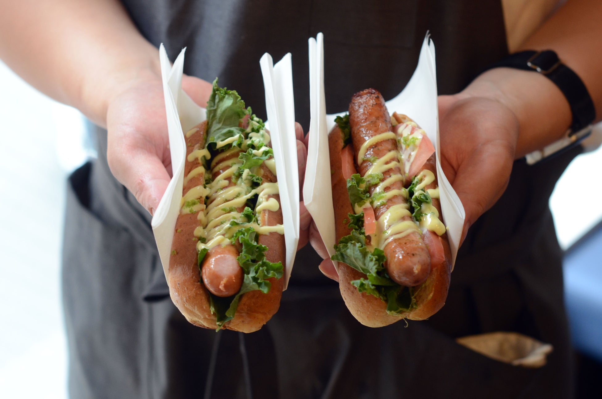 ワサビソーセージとケール、ワサビマヨネーズのホットドック