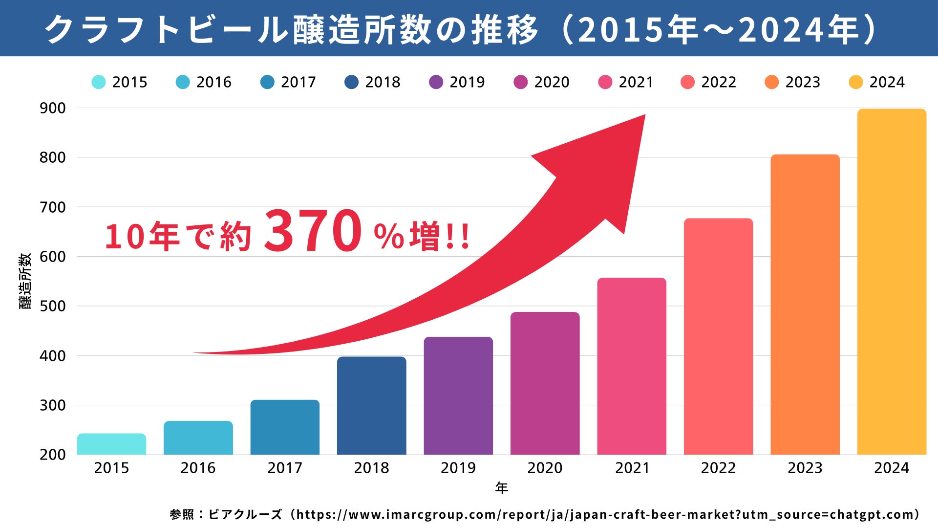 また、国内のクラフトビール醸造所の数も増加しており、2024年9月時点で828カ所に達しています。これは10年前と比較して3倍以上の増加となり、全国47都道府県すべてにブルワリーが存在する状況です 。
