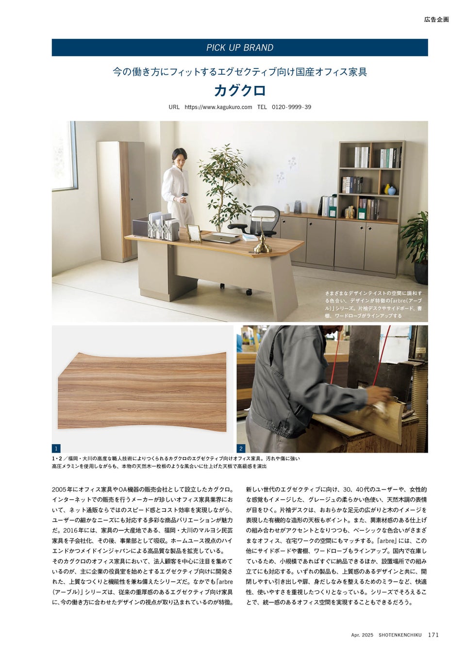 「いいものをいつでも、お値打ち価格で。」をコンセプトに、オフィス家具の製造から販売、内装やレイアウトまで、オフィス環境のトータルソリューションを提供するカグクロ株式会社(本社:東京都千代田区、代表:藤岡浩司)は、このたび2025年3月28日に発売された雑誌 「商店建築4月号(2025年4月号)」 に、福岡県大川市の自社工場で製造された国産オリジナル木製オフィス家具 ”arbre(アーブル)” が掲載されました。