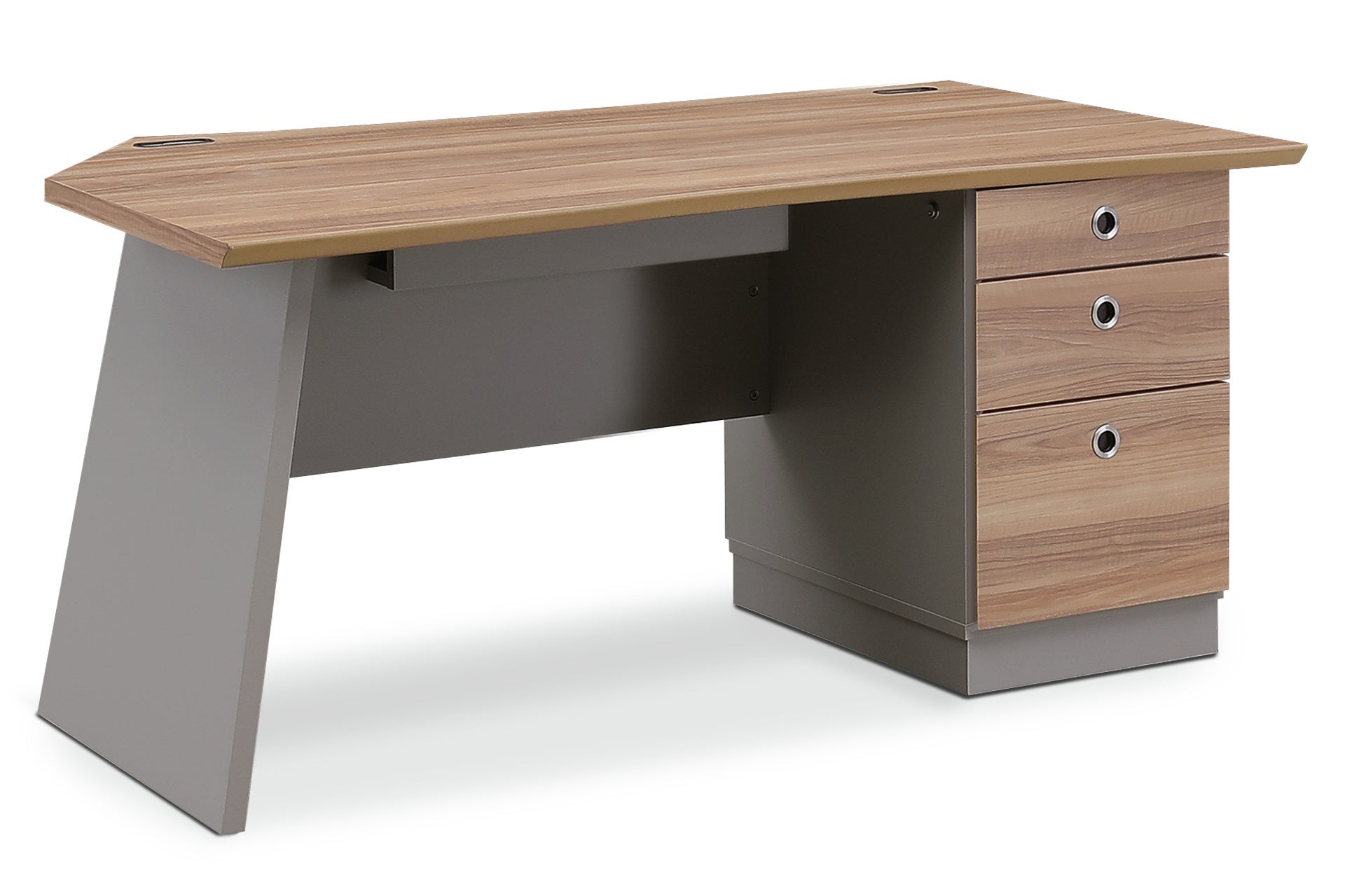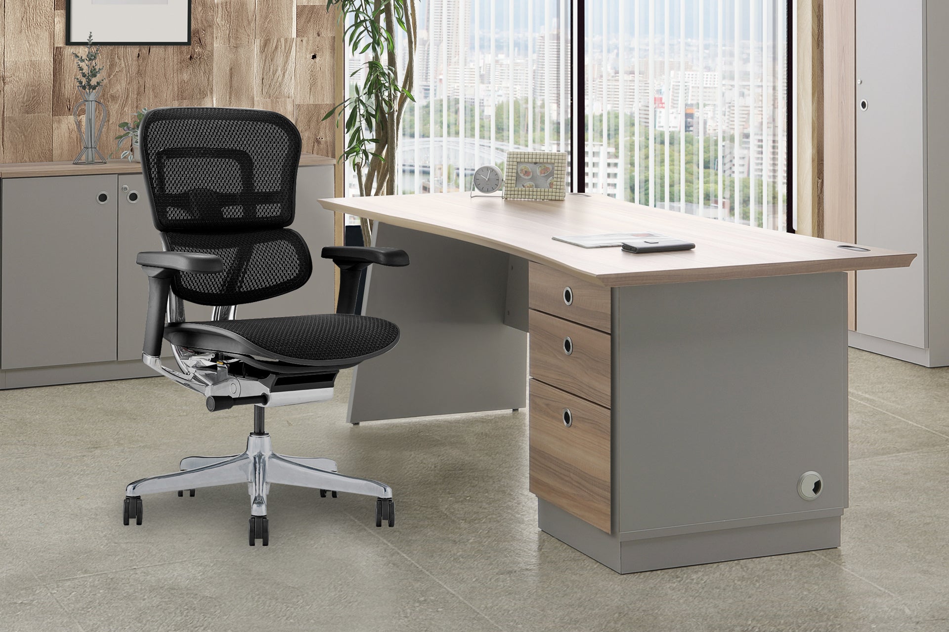 特徴的な木目とグレージュ色のツートンカラーが目を惹き、革新的なデザインと実用性を兼ね備えたこのシリーズは、デスクだけでなく、ワードローブやサイドボード、オープン書庫も展開しています。