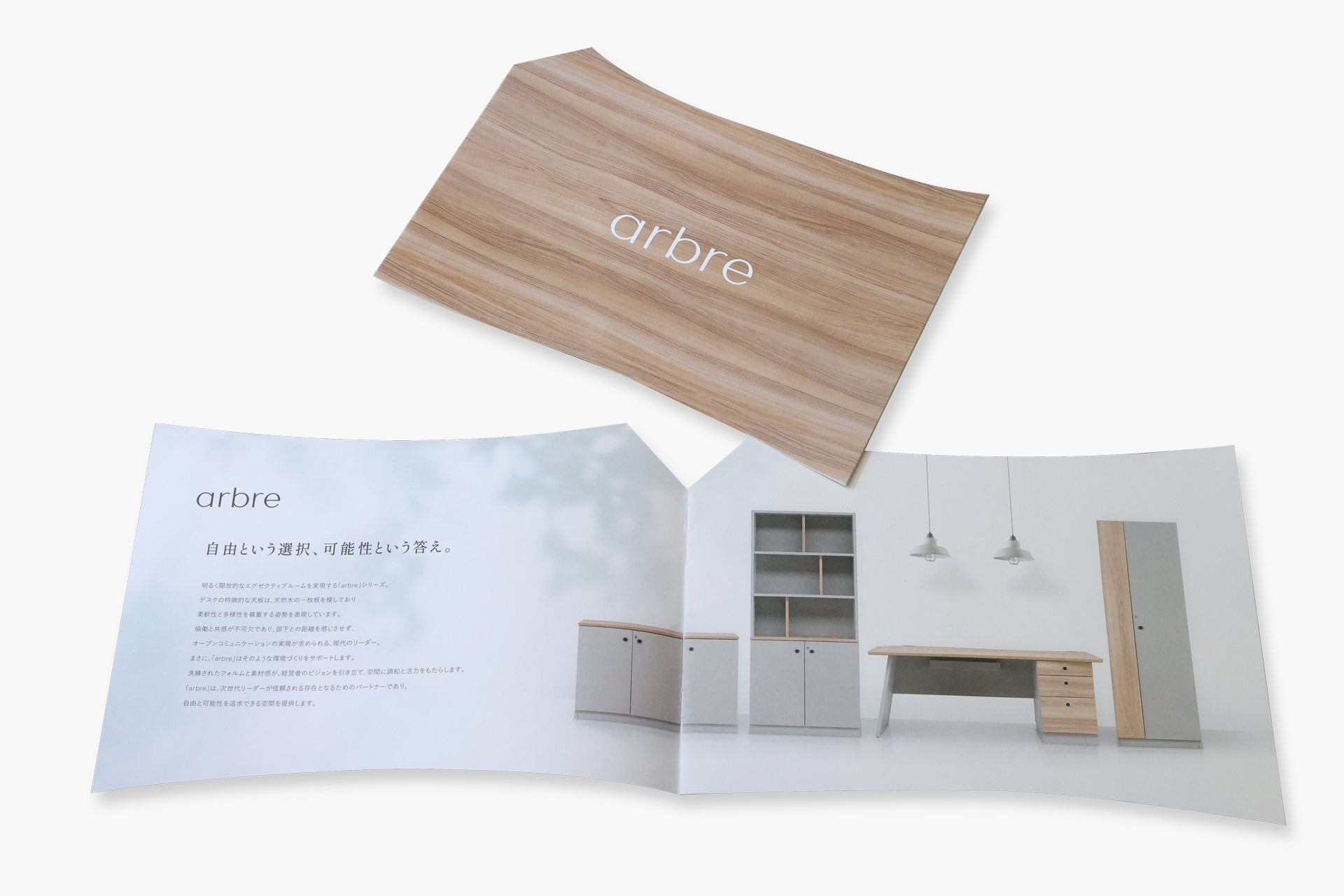 アーブル 片袖デスクの天板形状と同じ形をしているオリジナルのコンセプトブックを、ご請求いただいた方へ無料でお届けしております。