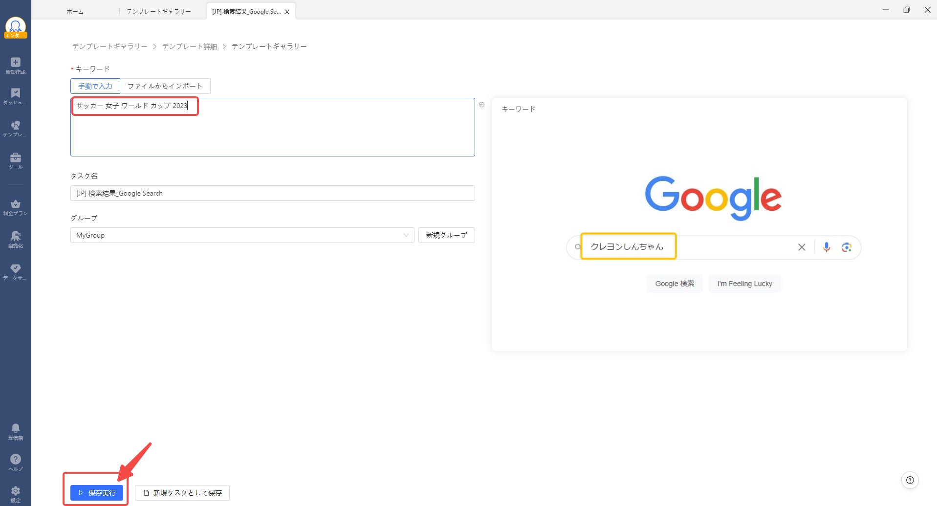 タスクのパラメータを設定: 検索キーワードの入力、「保存実行」をクリックします。