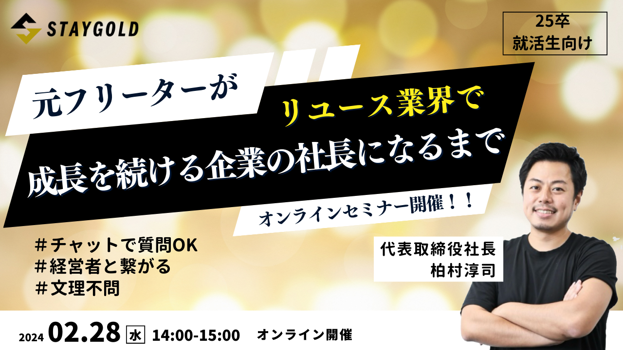 25卒就活生向け、オンラインセミナーを2月28日に開催決定「元フリーターがリユース業界で成長を続ける企業の社長になるまで」