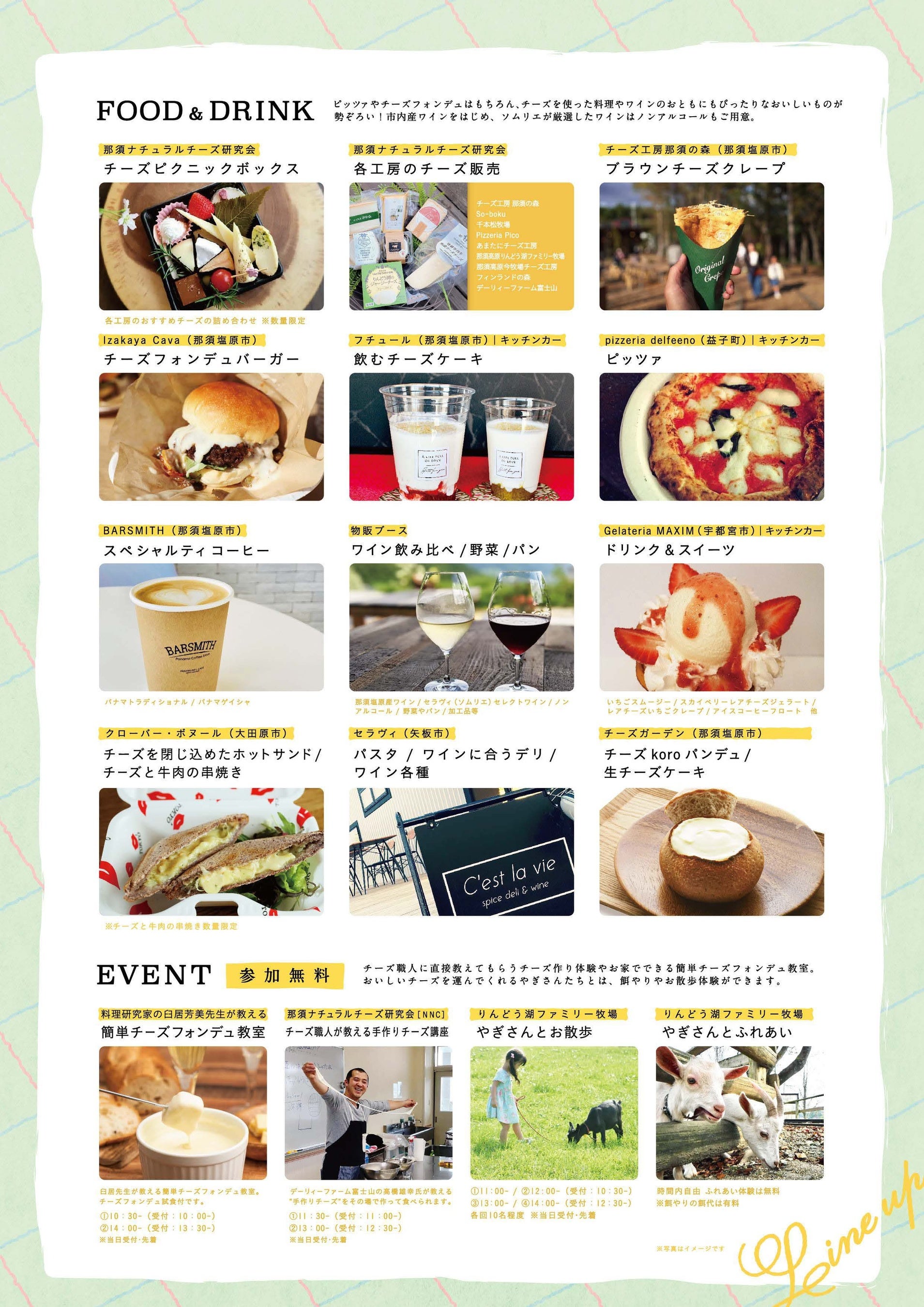 ・那須地域のチーズ工房のチーズが一同に集まるとともに、チーズに合うワイン、キッチンカーの出店、農畜産物などの販売