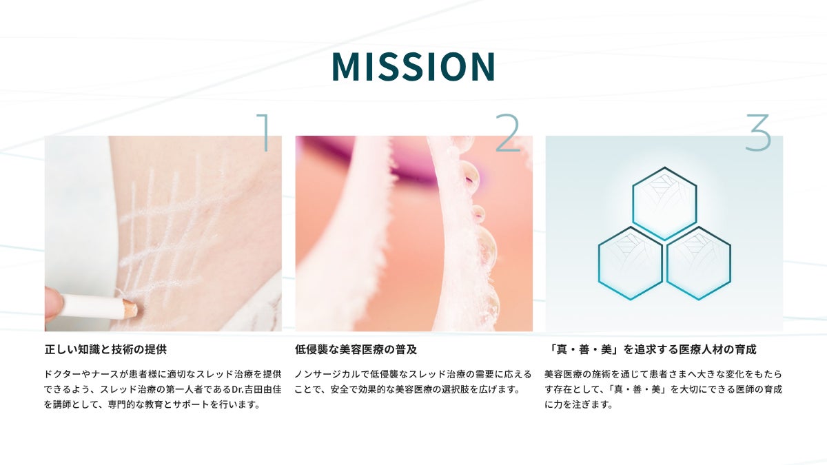 THE THREAD BEAUTY ACADEMYのミッションは、真・善・美を兼ね備え、患者様に適切なスレッド治療を提供できる医師の育成です。今後さらに需要の高まりが見込まれるノンサージカルかつ低侵襲なスレッド治療において、確かな技術の普及を促進し、美容医療業界の健全な発展に貢献してまいります。