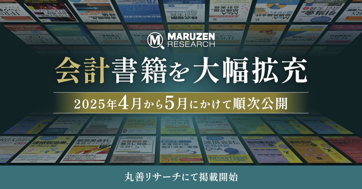 株式会社丸善リサーチサービス(本社:東京都新宿区、代表取締役社長:五味英隆)と株式会社Legal Technology(本社:東京都千代田区、代表取締役CEO:二木康晴)が共同で運営する会計・税務書籍の検索閲覧サービス「丸善リサーチ」は、株式会社中央経済グループパブリッシングの協力のもと、監査法人や企業経理部が信頼を寄せる多数の会計書籍を2025年4月より順次掲載いたします。
