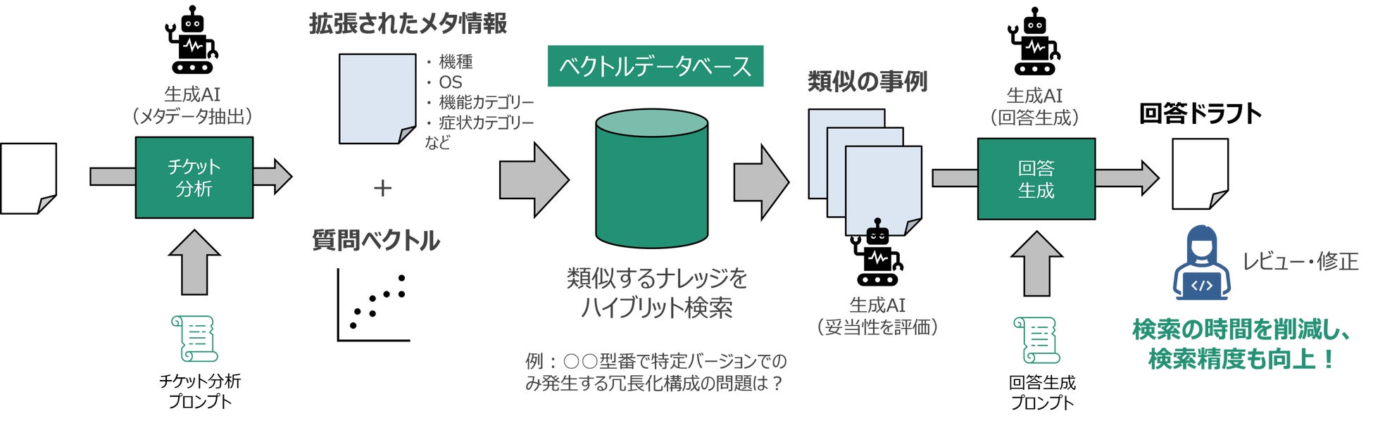 生成AIとベクトルDBを組み合わせ、過去のチケットから関連情報を迅速に検索。