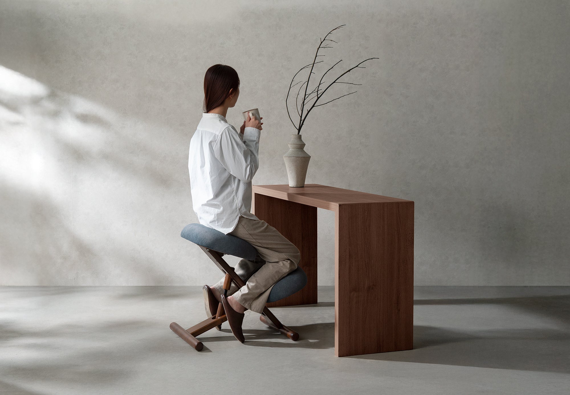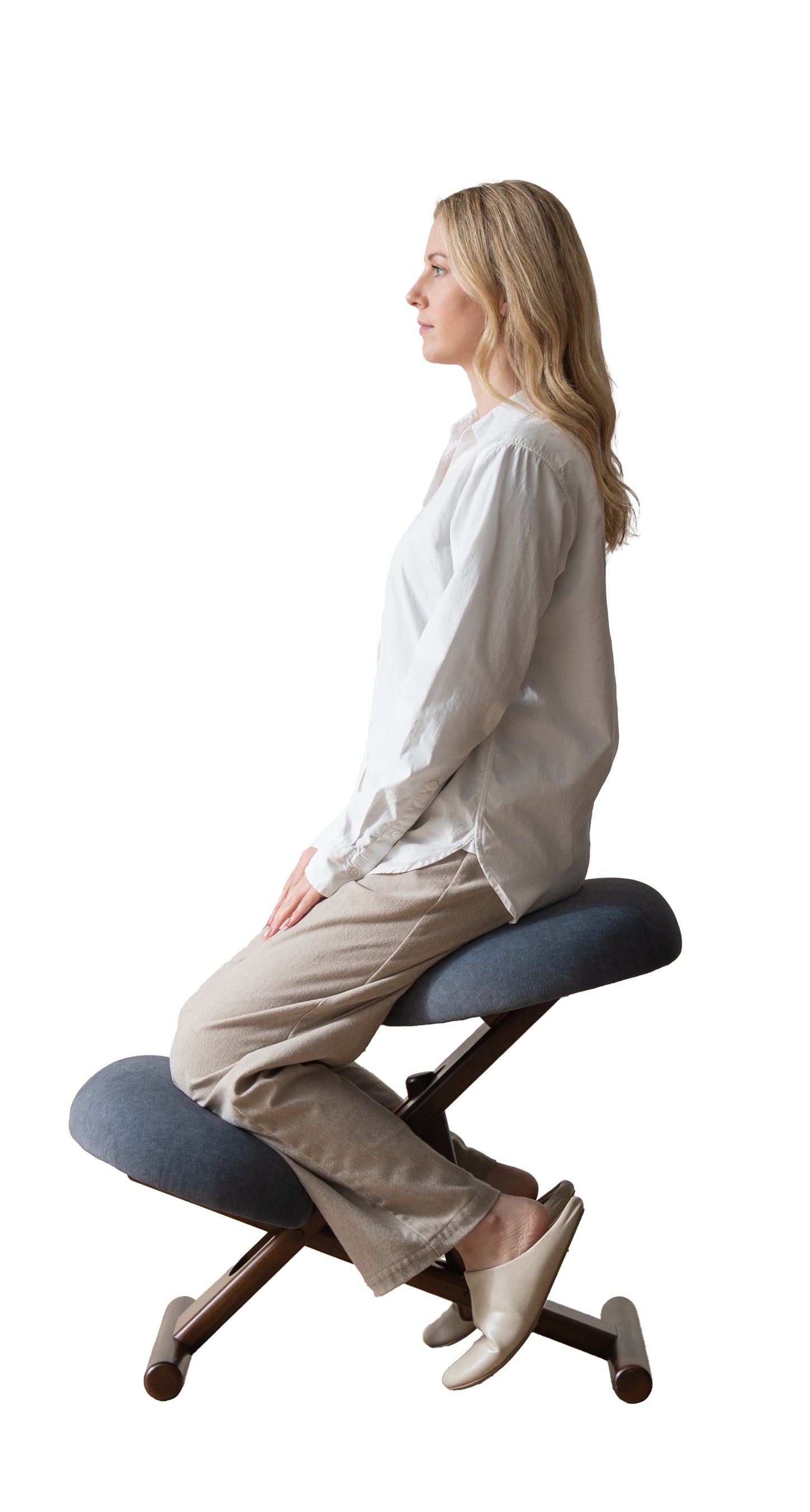 『プロポーションチェア®』なら、斜めの座面が立ち姿勢のように骨盤が立つので自然と背中がS字カーブを描き、理想的な姿勢を作り出せます。