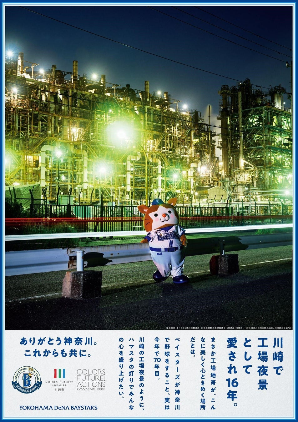 ポスターについては、川崎市の観光資源の1つである「工場夜景」スポットを、球団マスコットキャラクターの「DB.スターマン」が訪れている様子をポスターにしたものとなっています。