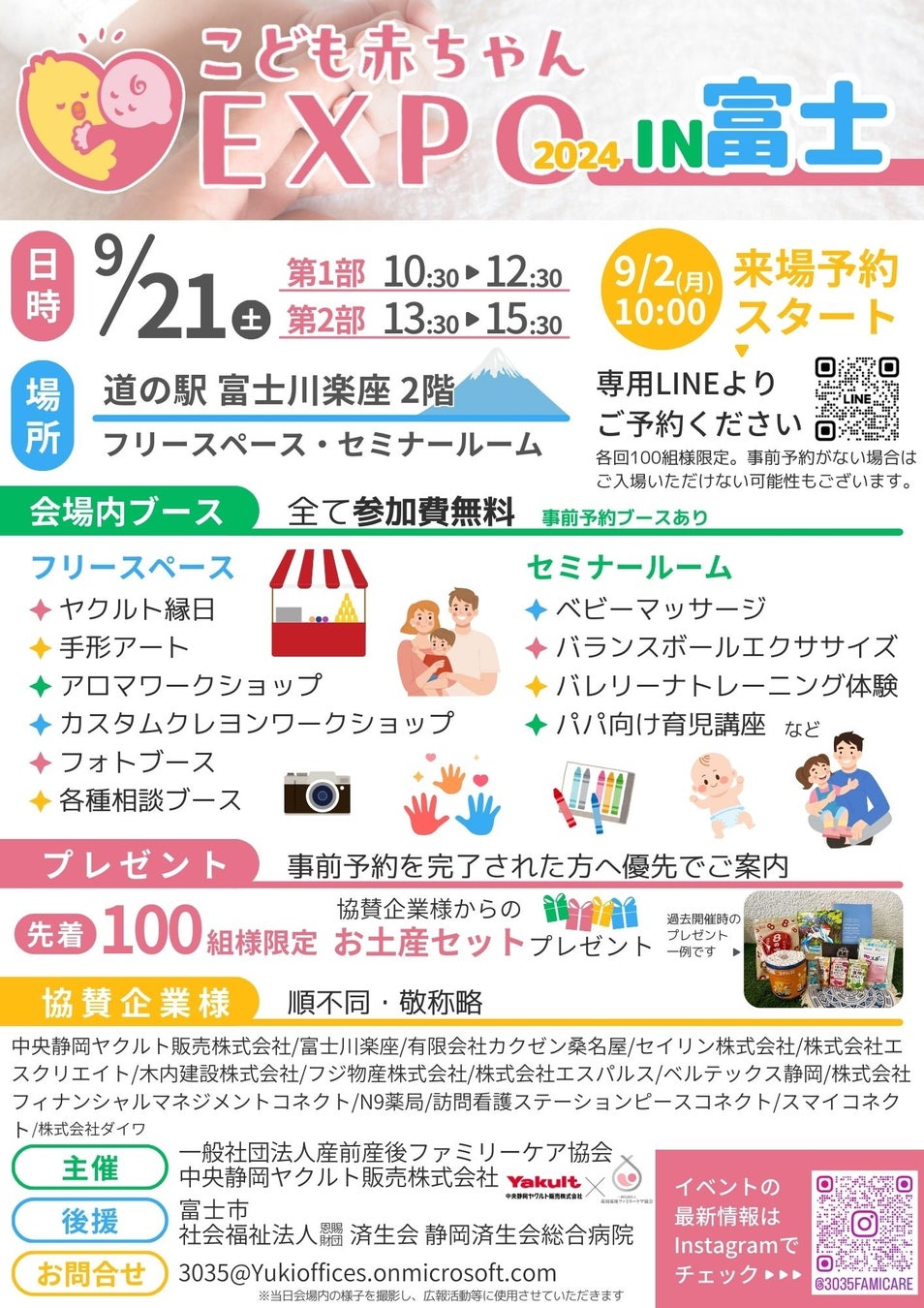 一般社団法人産前産後ファミリーケア協会は、9月21日(土)静岡県富士市の富士川楽座で『こども赤ちゃんEXPO2024 in富士』を開催いたします。9月2日10時来場予約スタートです。