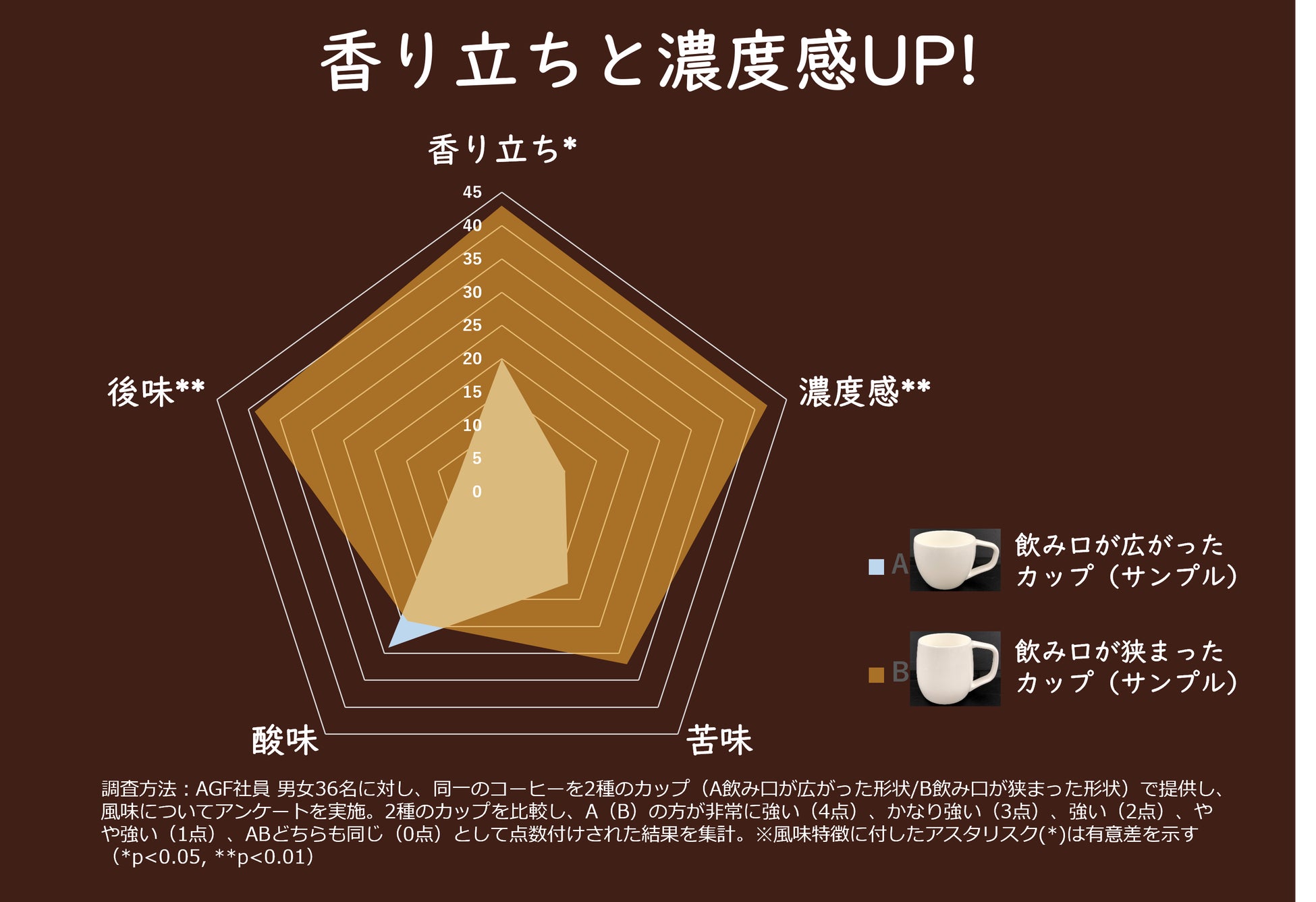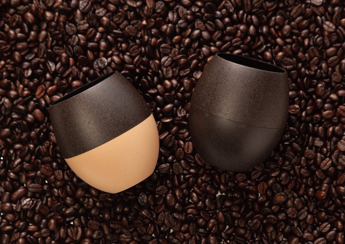 味の素AGFの工場でコーヒー豆の品種の切り替え時に生じるコーヒーの副産物や規格外の コーヒーを原料にして作られたカップです。<Black>と<Latte>の2種を開発しました。味の素AGFのコーヒー開発の知見を活かし、味覚・嗅覚研究を経て、「コーヒーの香りがひきたつ」形状を実現しました。広い液面からうまれた香りをカップ内にとどめるデザインにすることで芳しい香り立ちを際立たせ、コーヒーの味わいをはっきりと感じることができます。下半分は二重構造となっているため熱が逃げづらく、コーヒーの温度が長持ちします。
