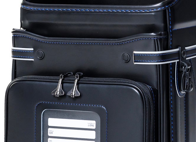 本体素材はより傷や雨に強いクラリーノ®︎タフロック®︎NEO。肩ベルトに楽ピタ®︎、背カンにエアロキャッチ®︎を搭載することで、小さいからだのお子さんも背負いやすい設計になっています。かぶせ(ふた)のパイピングとマチベルトには、雨の日や暗い道で車のライトが当たると光る反射材を、肩ベルトには反射鋲をほどこしました。