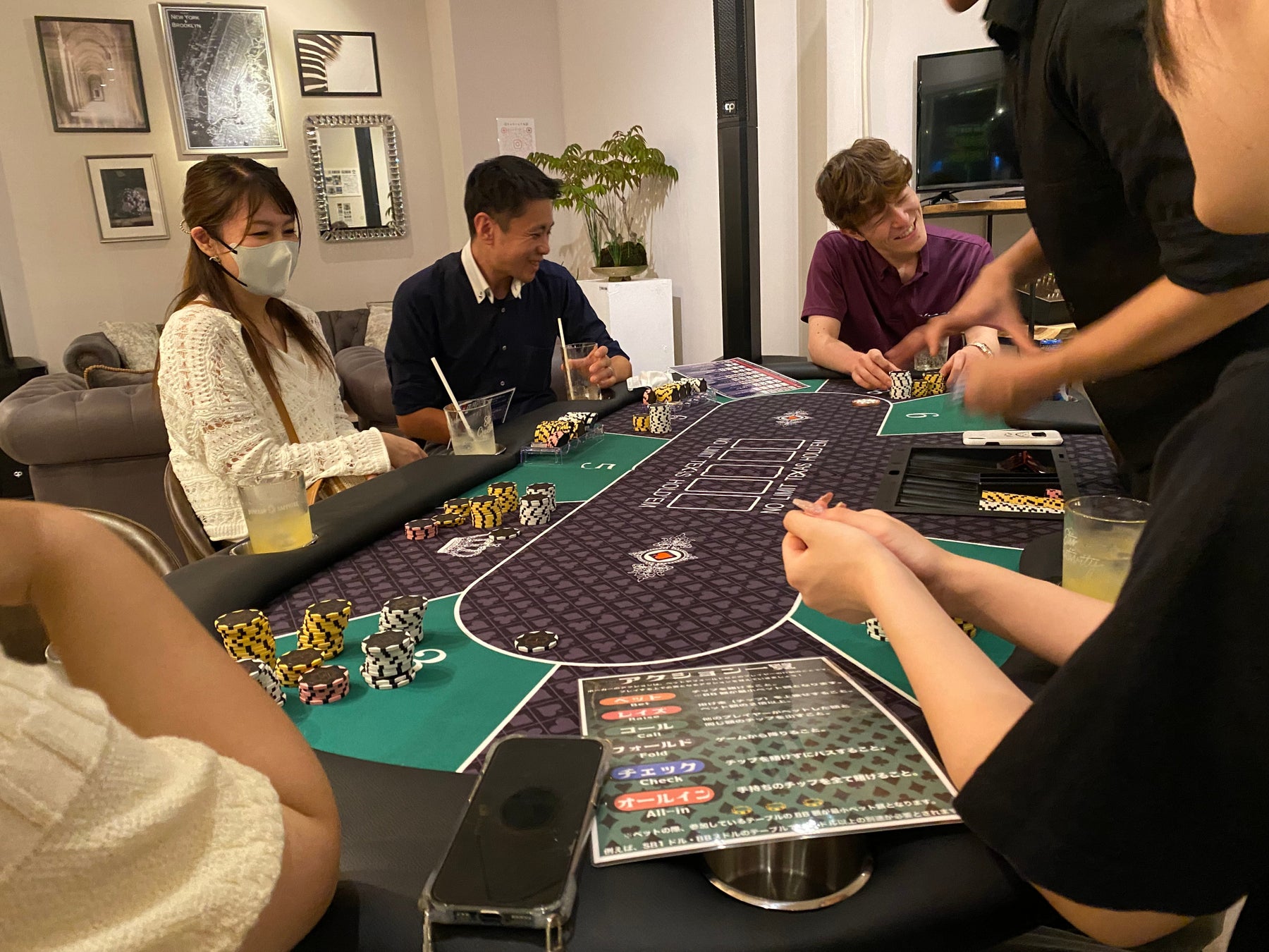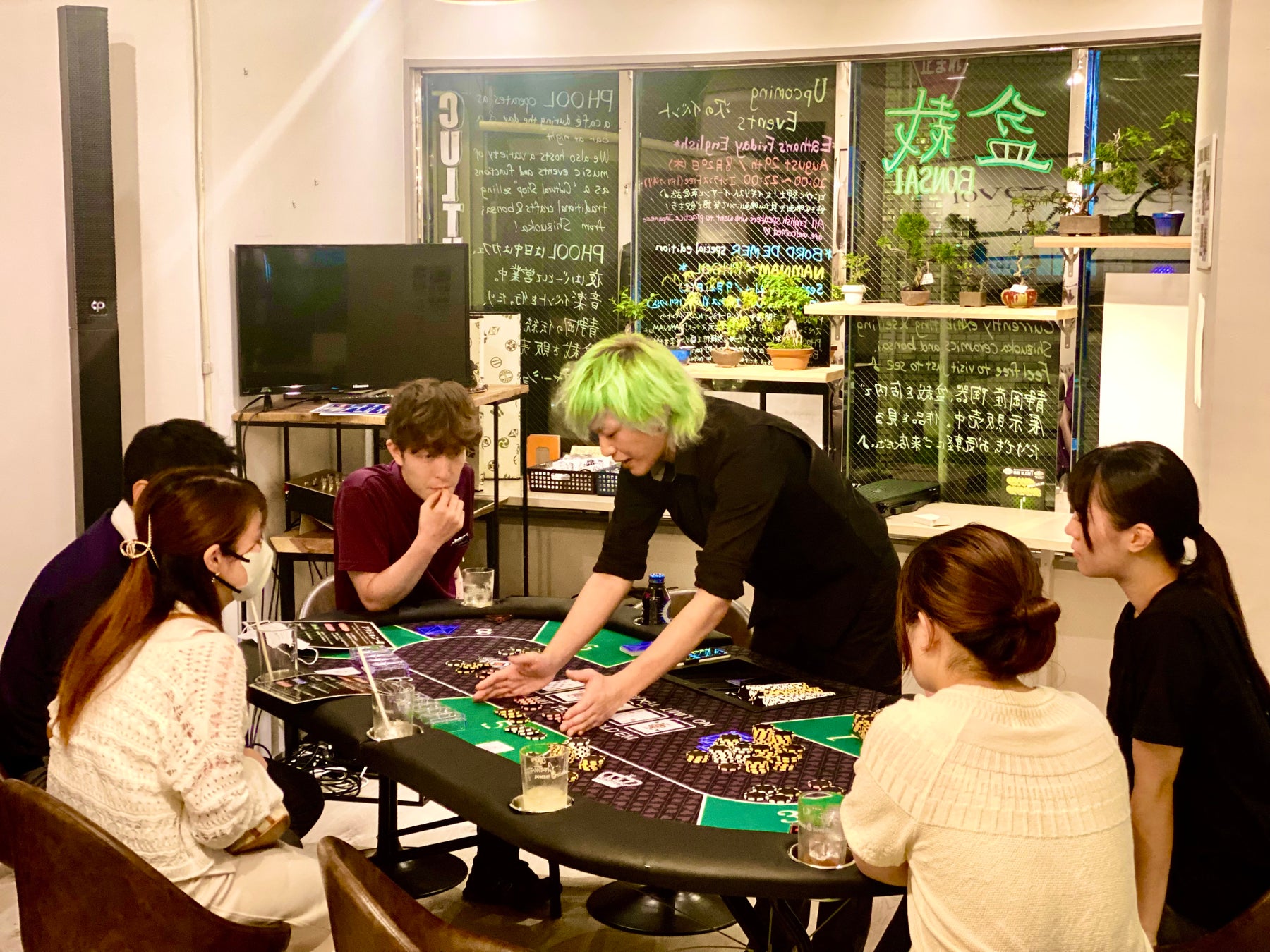 ソファやテーブル席が並ぶ店内・中央奥にポーカーテーブルが設置され、最大9名が同時にゲームを楽しめます。ポーカーをやったことがない方にはディーラーが冒頭でルールを説明し、プレイ中もガイドしていきますので、初心者の方でも安心して遊んで頂けます。