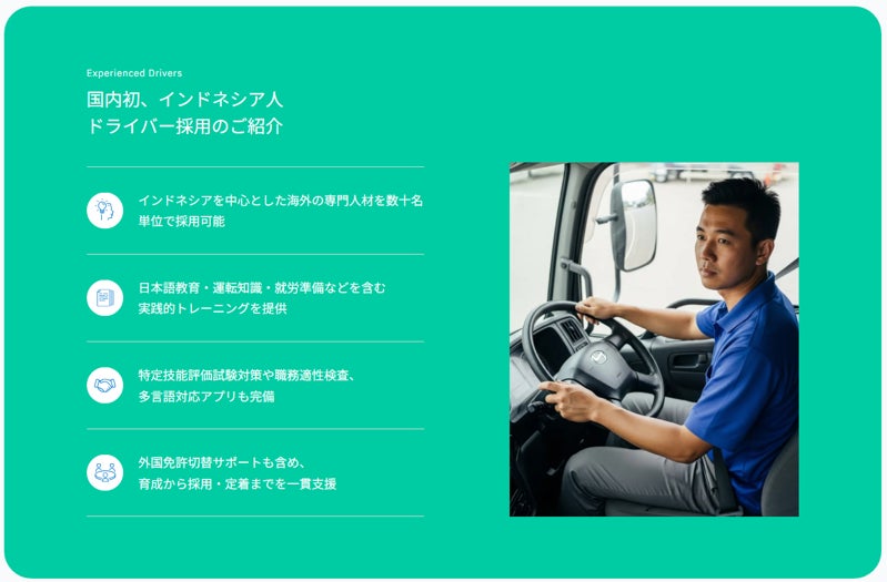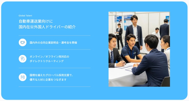 本サイトでは、企業の免許取得支援・外国免許切替支援・人材紹介・海外人材育成事業を通じて、「運転免許取得支援 × 人材採用支援」により企業の課題解決を総合的にサポートします。