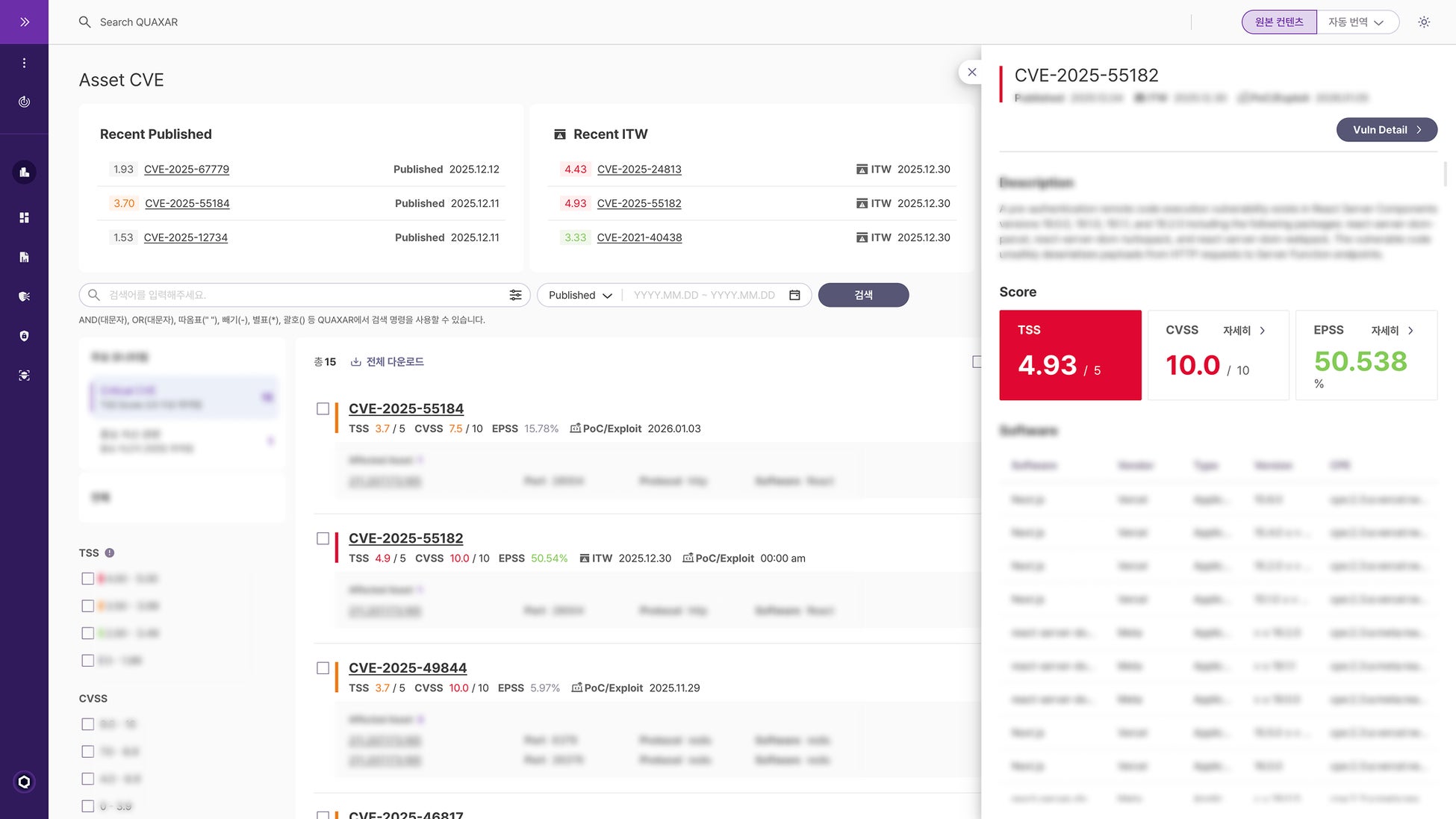 QUAXAR ASMは「資産検出-資産分析-継続的モニタリング」の3段階プロセスで構成されます。その差別化ポイントは、S2W脅威インテリジェンスセンター「TALON(タロン)」独自の脆弱性リスク算定方式である「TALON SCORE(タロンスコア)」にあります。従来は、該当する脆弱性が実際に悪用される可能性を統計的に予測し確率として提供する「EPSS(Exploit Prediction Scoring System)」や、脆弱性の技術的深刻度を定量的に評価しリスクレベルをスコアとして提供する「CVSS(Common Vulnerability Scoring System)」などの単純な指標に基づいていました。
