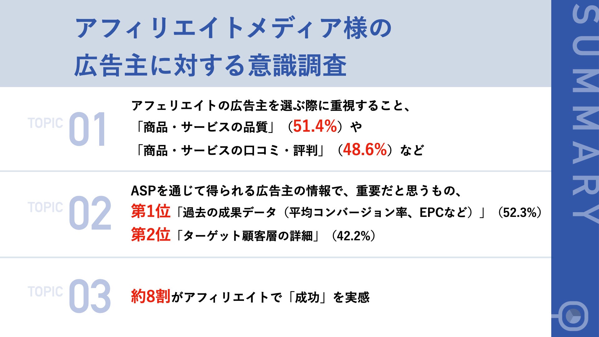 01|アフェリエイトの広告主を選ぶ際に重視すること、「商品・サービスの品質」(51.4%)や「商品・サービスの口コミ・評判」(48.6%)など