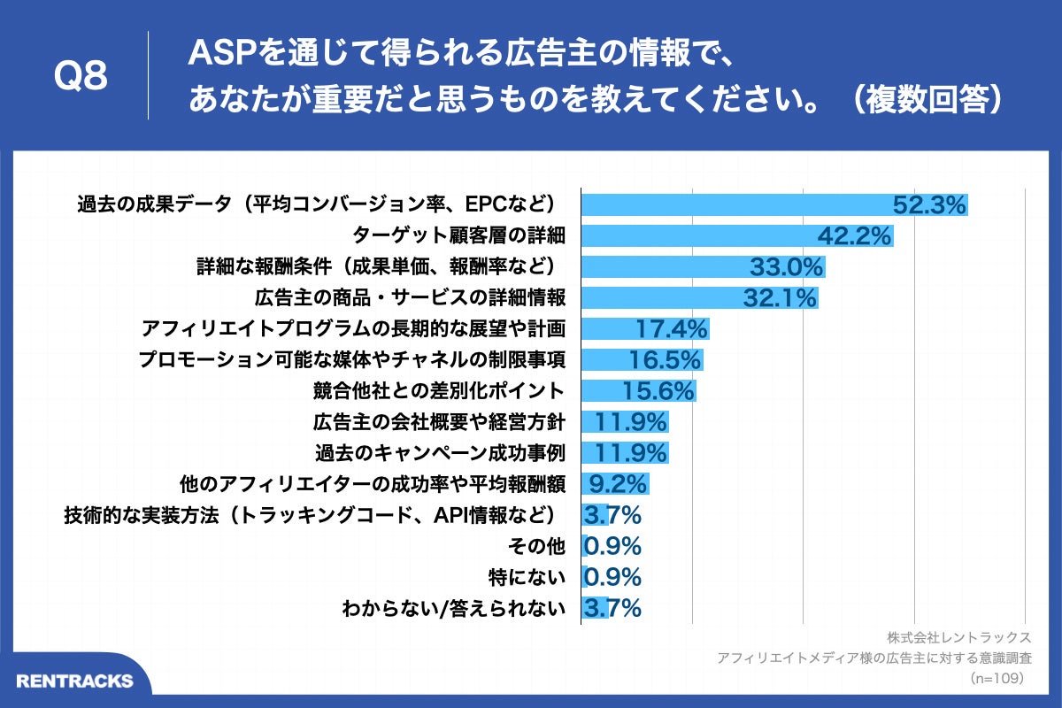 「Q8.ASPを通じて得られる広告主の情報で、あなたが重要だと思うものを教えてください。(複数回答)」(n=109)と質問したところ、「過去の成果データ(平均コンバージョン率、EPCなど)」が52.3%、「ターゲット顧客層の詳細」が42.2%、「詳細な報酬条件(成果単価、報酬率など)」が