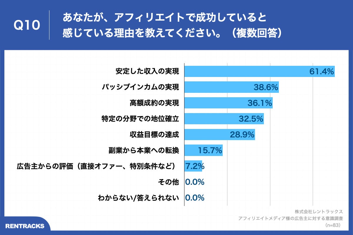 Q9で「非常に感じている」「やや感じている」と回答した方に、「Q10.あなたが、アフィリエイトで成功していると感じている理由を教えてください。(複数回答)」(n=83)と質問したところ、「安定した収入の実現」が61.4%、「パッシブインカムの実現」が38.6%、「高額成約の実現」が