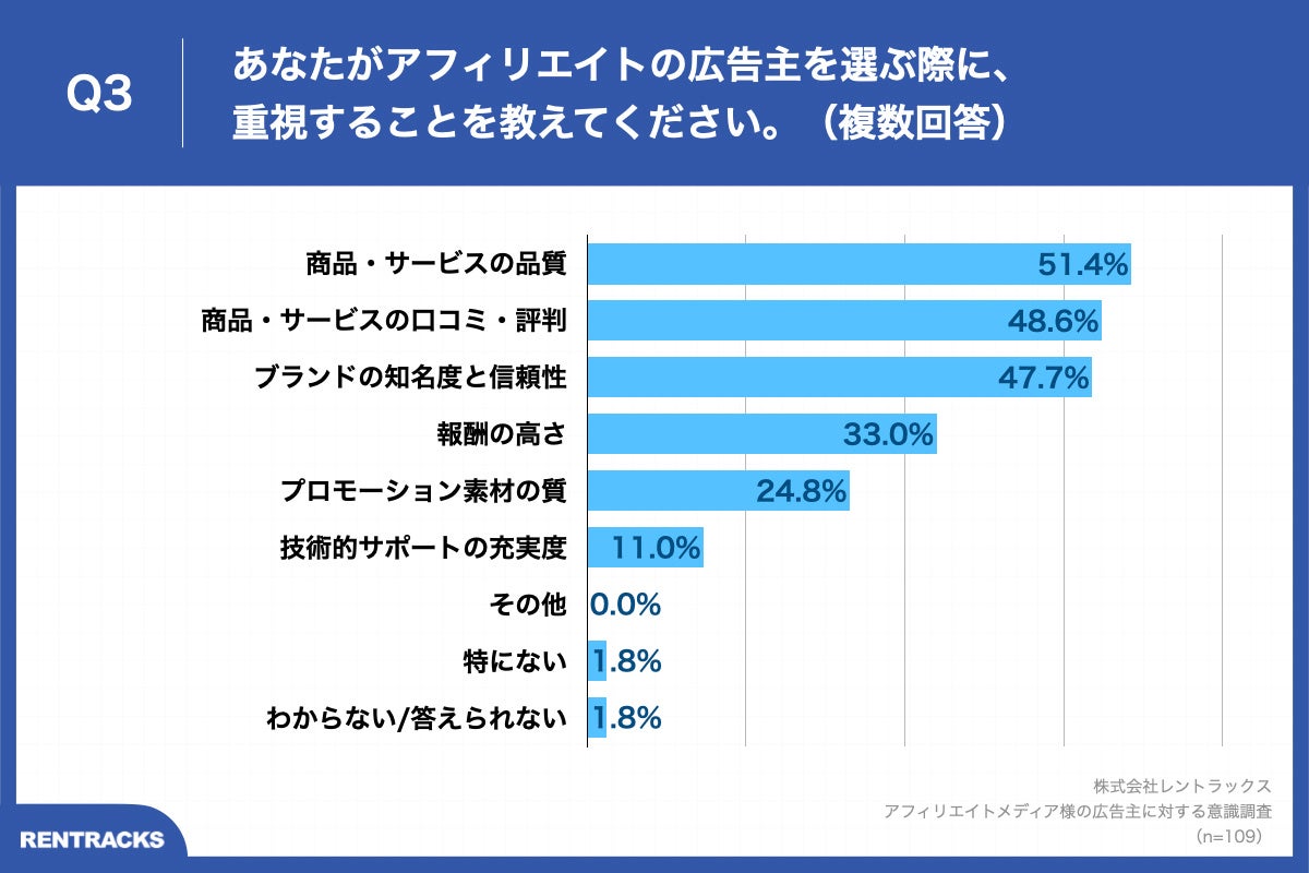 「Q3.あなたがアフィリエイトの広告主を選ぶ際に、重視することを教えてください。(複数回答)」(n=109)と質問したところ、「商品・サービスの品質」が51.4%、「商品・サービスの口コミ・評判」が48.6%、「ブランドの知名度と信頼性」が47.7%という回答となりました。