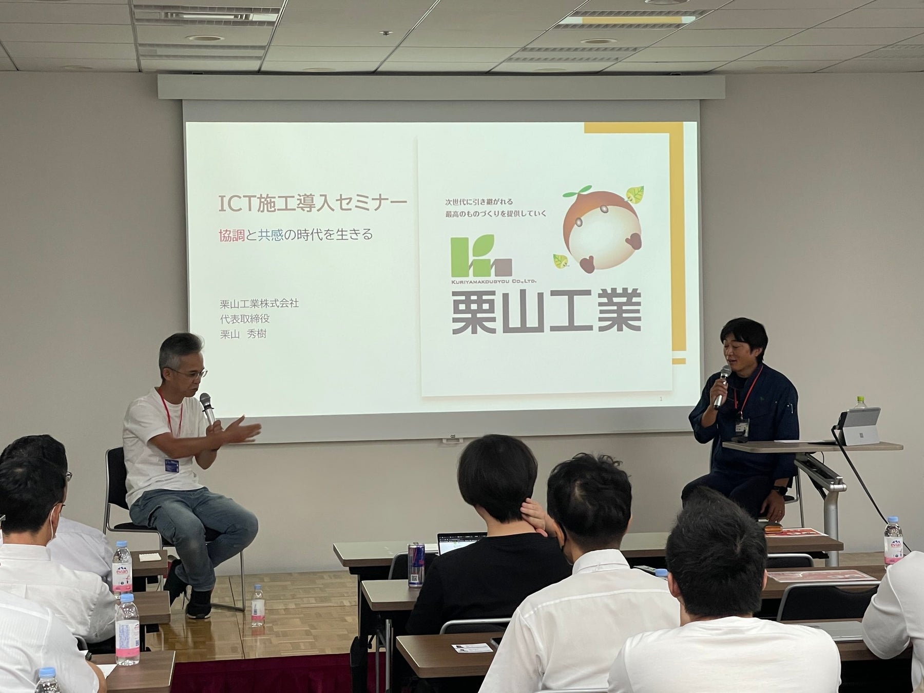 さらに、茨城県美浦村の栗山工業 栗山社長は、自社のICT施工部門立ち上げ時の経験や、未経験の若手社員を活用して内製化に成功した事例についてお話しいただきました。特に、教育コストの課題を克服し、若手の採用を通じて社内のICT技術の浸透を図った成功事例は、多くの参加者の共感を呼びました。