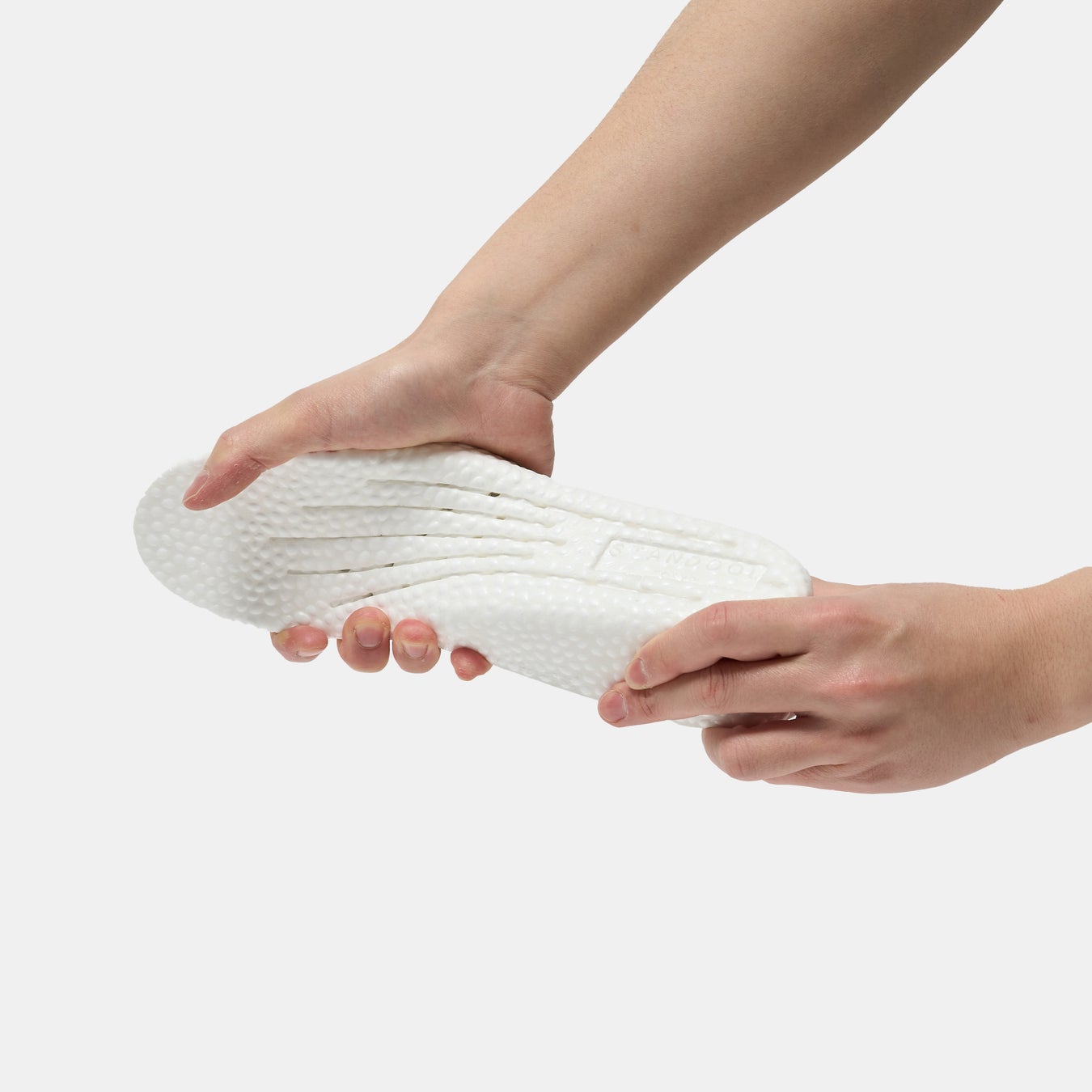 アッパーには上品かつ丈夫なマイクロファイバーを使用し、ソールは軽量性に優れたEVAから形成。インソールには、弾力性・吸汗性の優れたポップコーン素材(世界最大の総合化学メーカーであるドイツBASF社が開発した熱可塑性ポリウレタン発泡粒子E-TPUから生成)を使用しました。