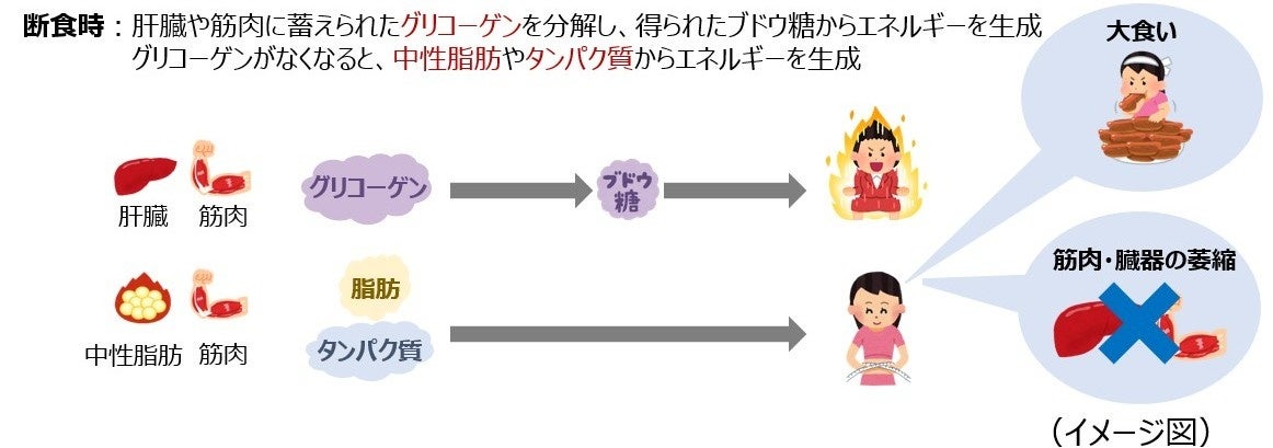 通常時には食事から摂取したブドウ糖から即エネルギーが生成されますが、断食時にはブドウ糖が不足することから肝臓や筋肉に蓄えられたグリコーゲンを分解してブドウ糖をつくり、そこからエネルギーを生成します。さらに断食中にグリコーゲンが不足してくると、まず脂肪細胞の中性脂肪がエネルギーとして使われ、次に臓器や筋肉を作っている中性脂肪やタンパク質からエネルギーを生成し始めるため、筋肉や臓器自体の萎縮を招きます。この状態を身体が危機と認識して、一気食いなどのリバウンドを招くリスクにつながります。