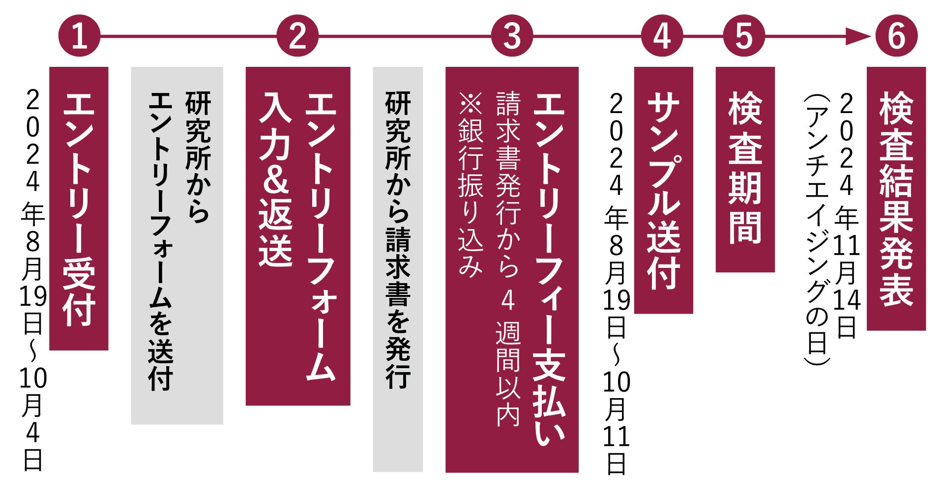 検査会終了後、エントリーワインについて研究所策定の認定条件を満たすかどうかの検査結果に加えて、没食子酸換算の総ポリフェノール量の測定値を提供します。なお、「エイジングケアワイン」として認定されたワインは、2024年11月14日(アンチエイジングの日)に研究所ホームページにて銘柄を公開する予定です。