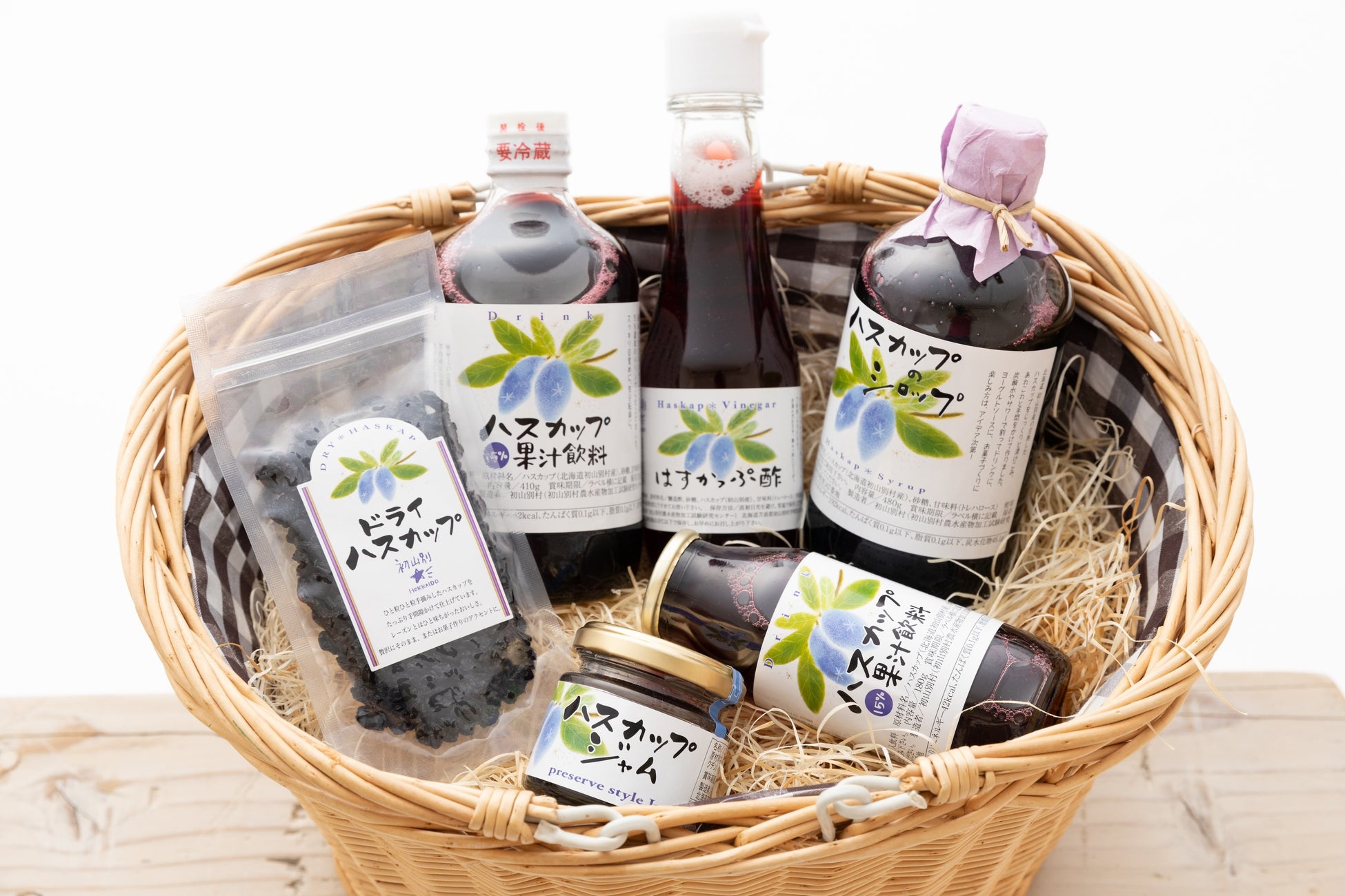 今回の詰合せは、初山別産の完熟したハスカップを贅沢に使ったジャム、ハスカップをゆっくりと搾り酸味と甘さのバランスが良い15%濃度に仕上げたドリンク、ハスカップをじっくりと漬けこみ手間をかけて作ったシロップ、お料理の隠し味や朝の一杯にぴったりなはすかっぷ酢、ひと粒ひと粒手摘みしたハスカップの甘酸っぱさをそのまま乾燥させたドライハスカップが楽しめます。 (https://www.furusato-tax.jp/product/detail/01485/5944591)