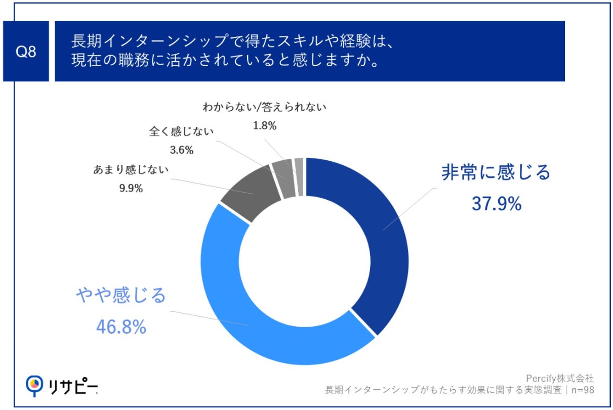 「Q8.長期インターンシップで得たスキルや経験は、現在の職務に活かされていると感じますか。」(n=111)と質問したところ、「非常に感じる」が37.9%、「やや感じる」が46.8%という回答となりました。