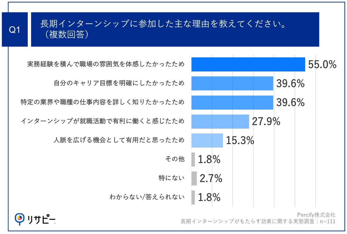 「Q1.長期インターンシップに参加した主な理由を教えてください。(複数回答)」(n=111)と質問したところ、「実務経験を積んで職場の雰囲気を体感したかったため」が55.0%、「自分のキャリア目標を明確にしたかったため」が39.6%、「特定の業界や職種の仕事内容を詳しく知りたかったため」が39.6%という回答となりました。