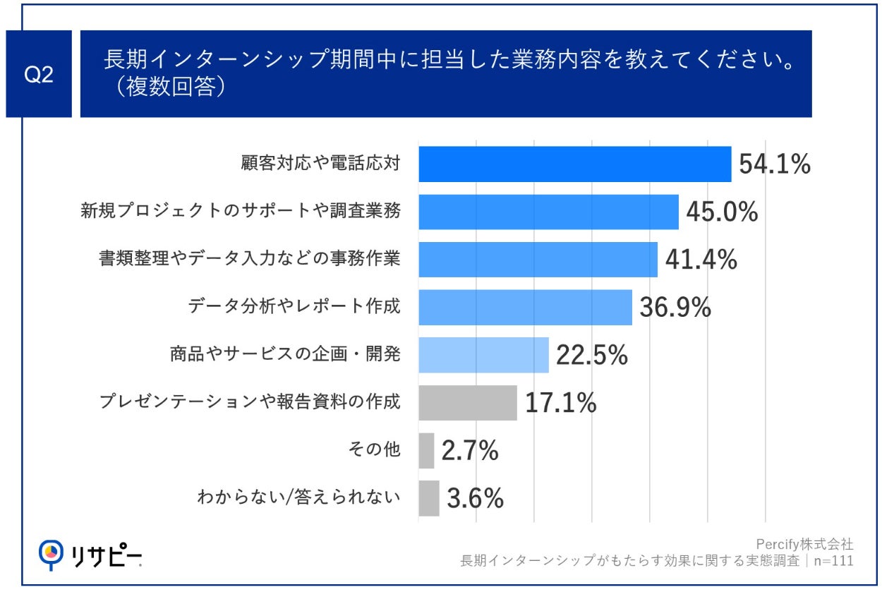 「Q2.長期インターンシップ期間中に担当した業務内容を教えてください。(複数回答)」(n=111)と質問したところ、「顧客対応や電話応対」が54.1%、「新規プロジェクトのサポートや調査業務」が45.0%、「書類整理やデータ入力などの事務作業」が41.4%という回答となりました。