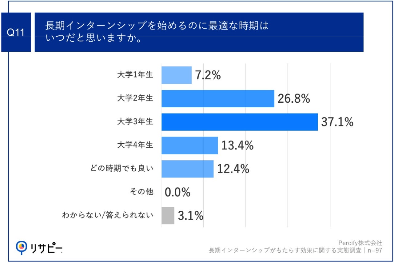 Q10で「非常に思う」「やや思う」と回答した方に、「Q11.長期インターンシップを始めるのに最適な時期はいつだと思いますか。」(n=97)と質問したところ、「大学3年生」が37.1%、「大学2年生」が26.8%、「大学4年生」が13.4%という回答となりました。