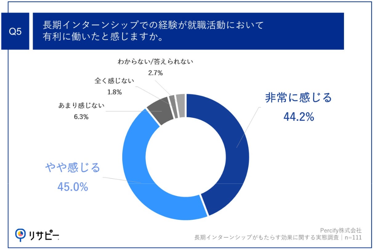 「Q5.長期インターンシップでの経験が就職活動において有利に働いたと感じますか。」(n=111)と質問したところ、「非常に感じる」が44.2%、「やや感じる」が45.0%という回答となりました。