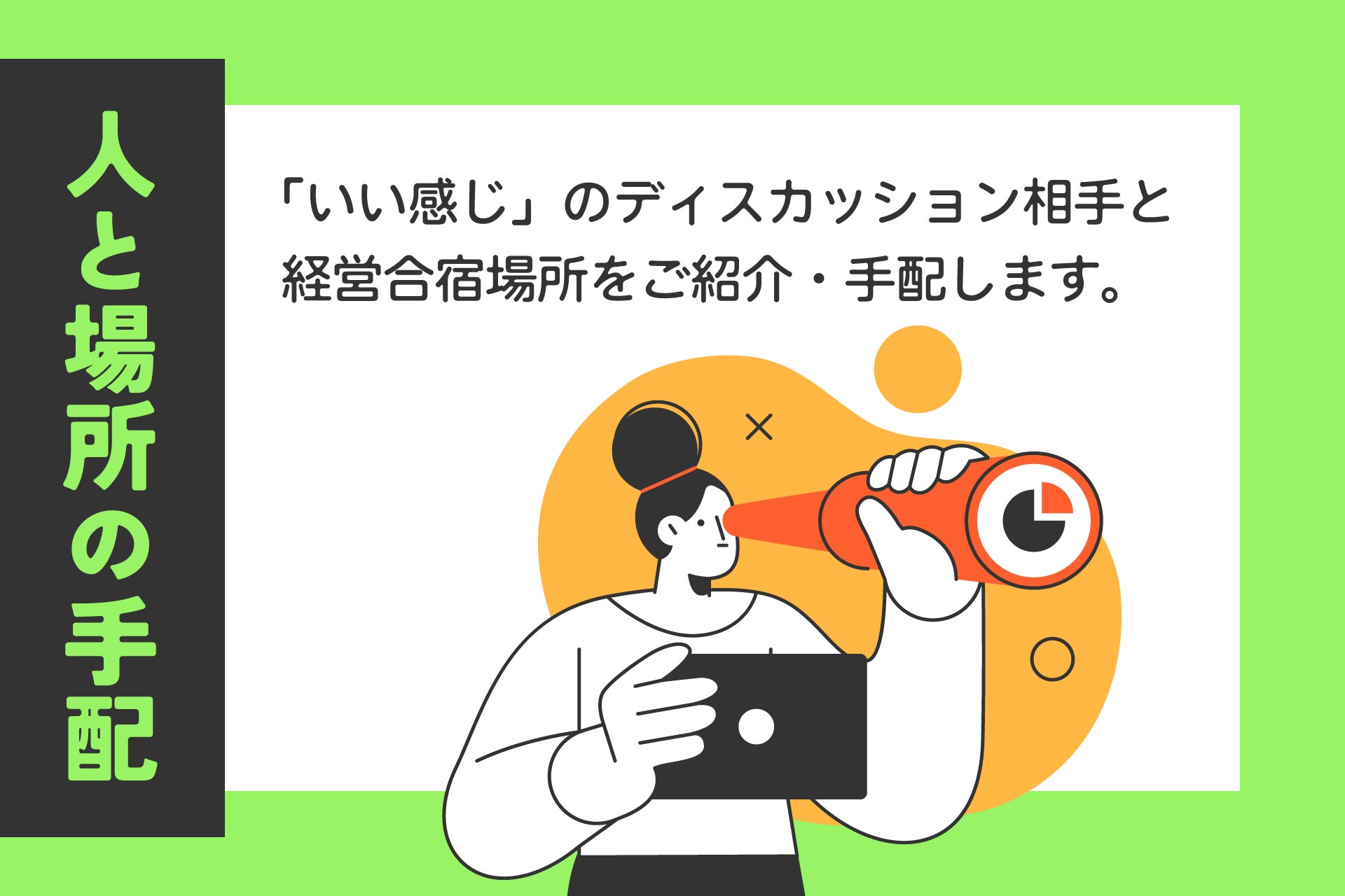 ①合宿のテーマに合わせた「ディスカッション相手」と「会場」を手配します!