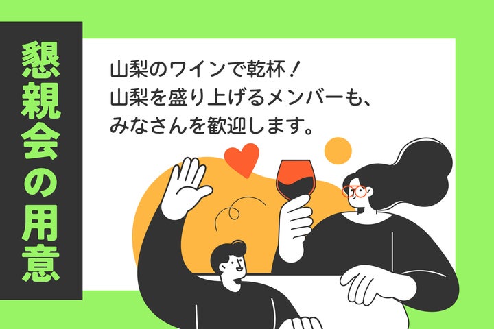 経営合宿の最後には、懇親会をご用意。山梨県内企業や地域プレイヤーなど山梨を盛り上げるメンバーも参加し、みなさんを歓迎します。
