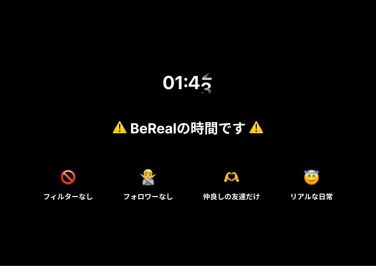 1日1回、ランダムなタイミングで通知が届き、ユーザーはフロントカメラとリアカメラの両方を使って、その瞬間に何をしているかを撮影・投稿します。