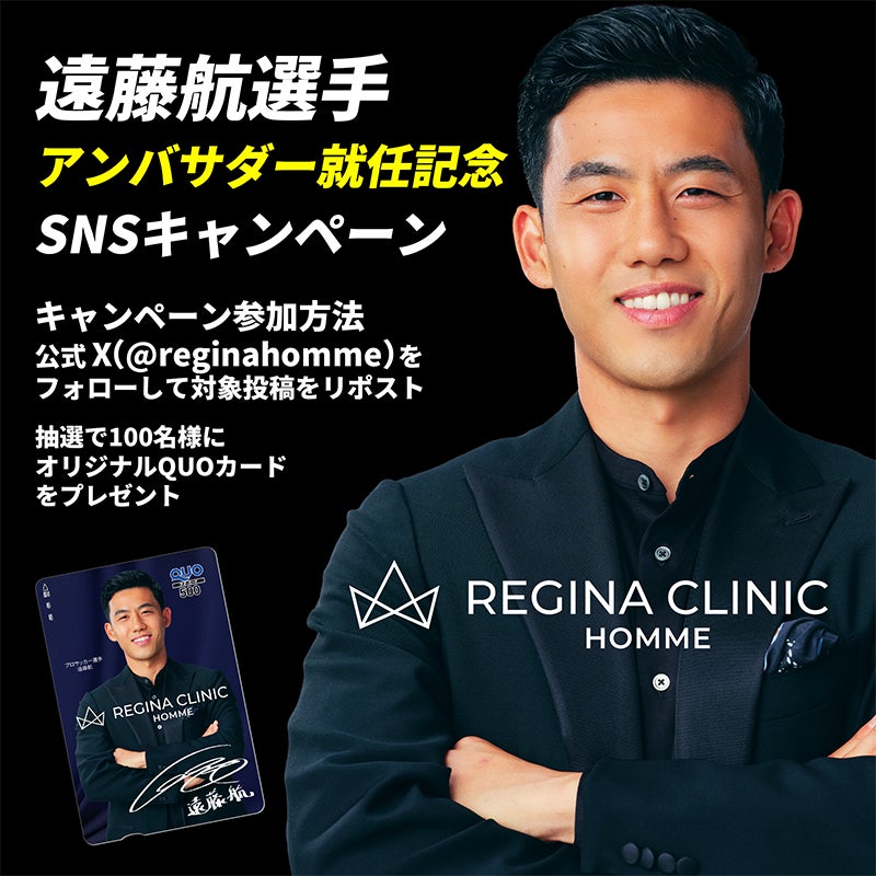 遠藤選手は、確かな実力に加え、周囲の仲間から厚い信頼を寄せられる人柄を備えた、“誠実の象徴”ともいえる存在です。その姿は、レジーナクリニックオムが掲げる「誠実さこそが、信頼される男の新しい身だしなみである」というメッセージを体現しています。