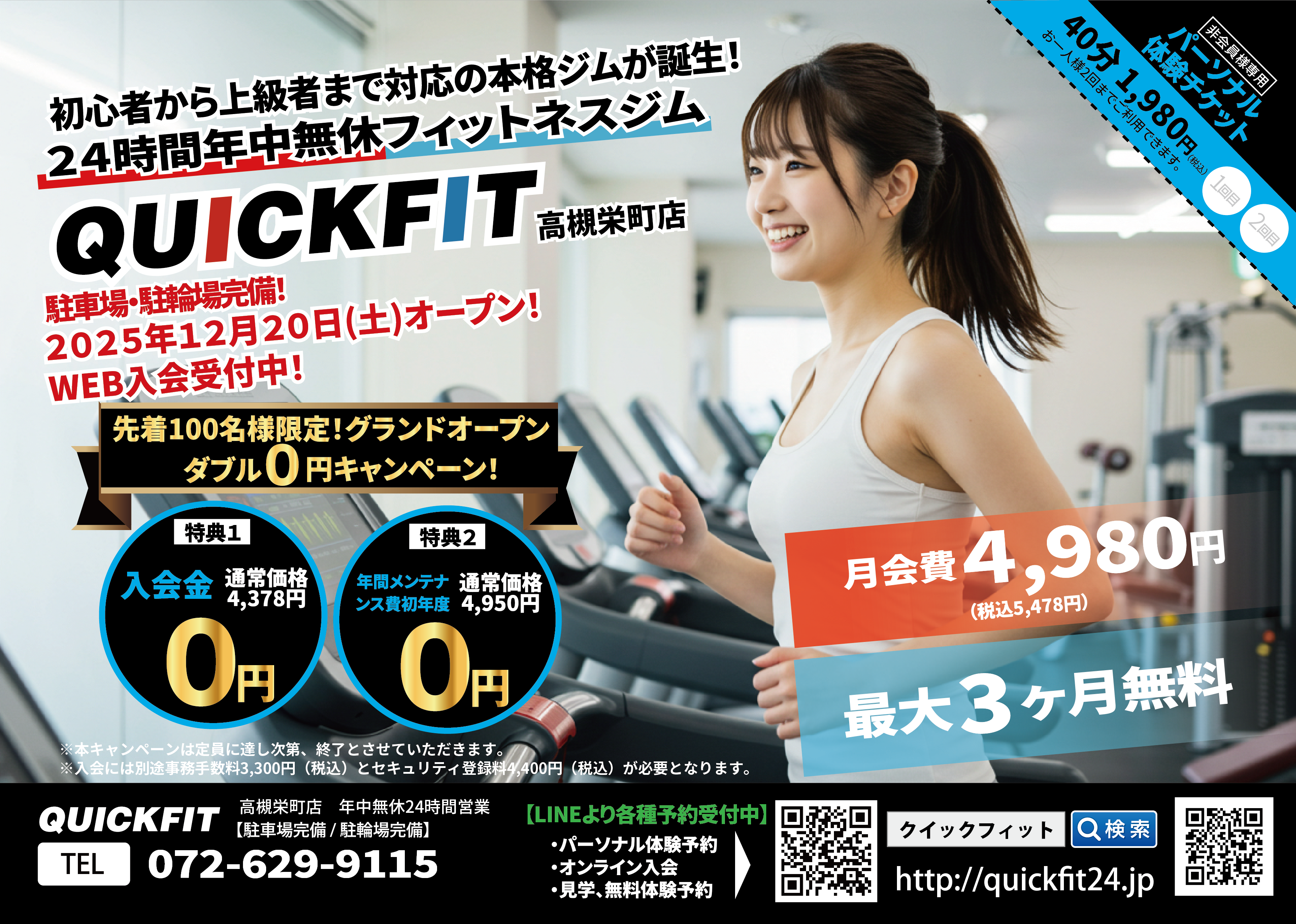 株式会社QUICKFIT(本社:大阪市羽曳野市)は、2025年12月20日(土)に、初心者から上級者まで全年齢に対応した本格24時間フィットネスジム『QUICKFIT高槻栄町店』をオープンいたします。