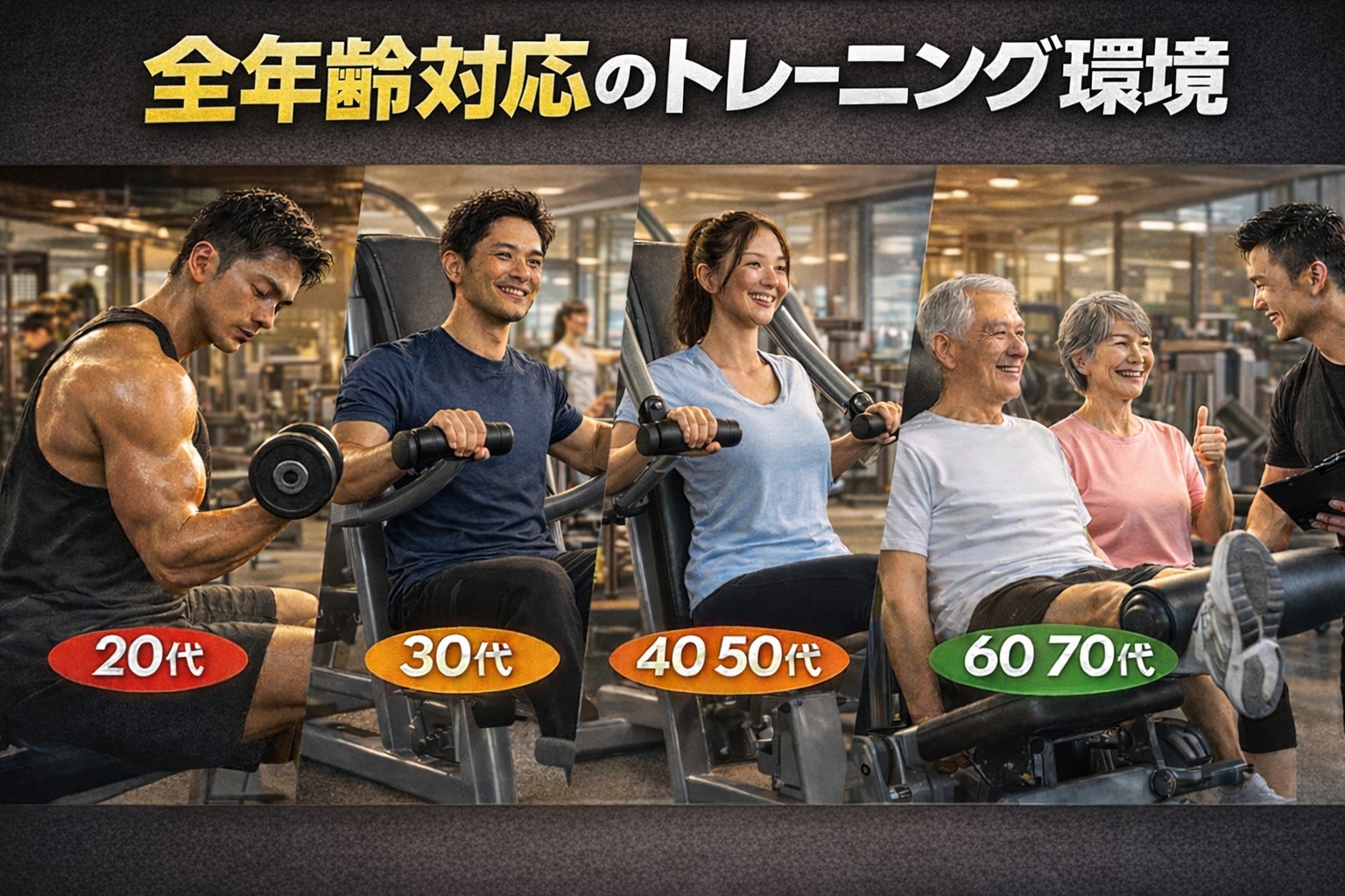 20代、30代の筋力アップから、40〜60代の健康維持、70代以上の介護予防運動まで、幅広い年齢層のニーズに対応できるマシンラインナップとサポート体制を整えています。