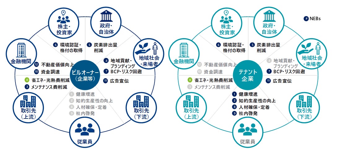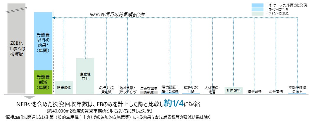 これまでNEBs指標は自社所有のオフィスビルを対象としていましたが、このたびテナント型のオフィスビルを対象に定量化ロジックを作成し、ビルオーナーとテナント企業それぞれに発現するNEBsを算定、ビルオーナー・テナントが省エネに取り組むそれぞれのベネフィットを分けて評価できるようになりました。