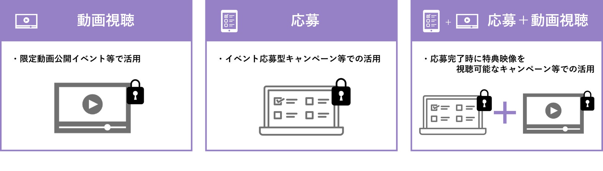 応募フォームを利用した「応募のみ」のキャンペーンや、応募フォームと動画視聴を組み合わせ、応募完了時に特典映像の視聴ができるといったキャンペーンの展開も可能となるなど、活用の幅が大きく拡がります。