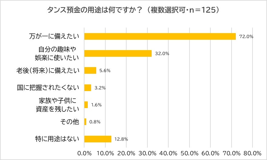 続いて、「タンス預金の用途」を訊いたところ、7割超が「万が一に備えたい」(72.0%)と回答し最多に。「自分の趣味や娯楽に使いたい」も3割超(32.0%)いる中、「国に把握されたくない」(3.2%)や「家族や子供に資産を残したい」(1.6%)という回答もありました。