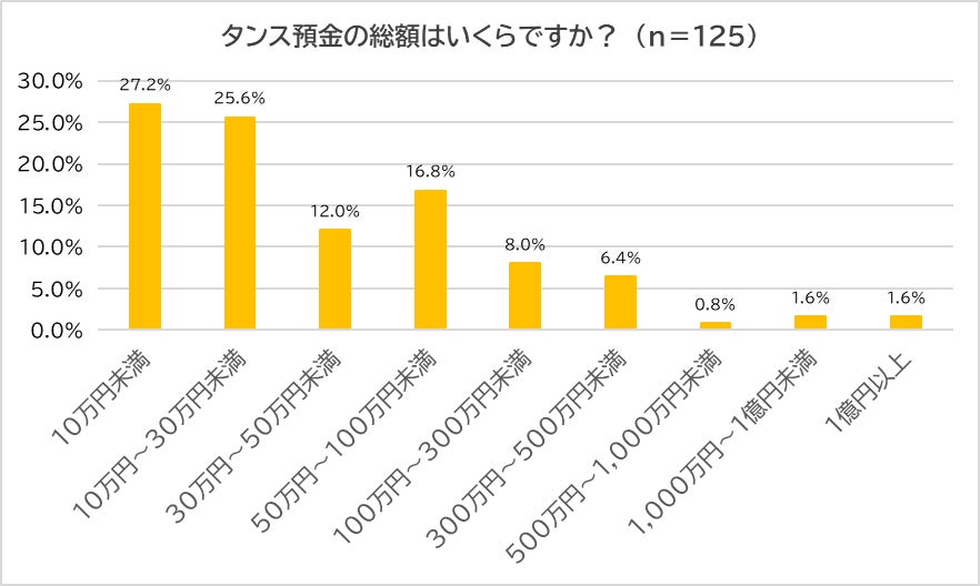 「(自宅で現金や財産を保管する)タンス預金はあるか?」訊き、「はい」(41.7%)と回答した125人に「タンス預金の総額」を訊いたところ、最多は「10万円未満」(27.2%)、以下「10万円~30万円未満」(25.6%)、「50万円~100万円未満」(16.8%)、「30万円~50万円未満」(12.0%)と続きました。これにより、タンス預金している人の約8割が100万円未満で、約半数が30万円未満と少額であることがわかりました。一方、「1,000万円~1億円未満」「1億円以上」(共に1.6%)もわずかながらいました。