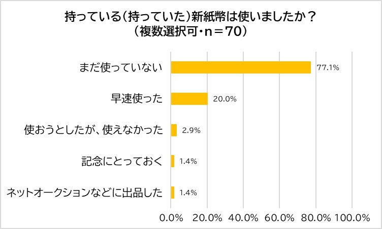 新紙幣を持っている(持っていた)と回答した70人に「新紙幣は使ったか?」訊いたところ、「まだ使っていない」(77.1%)が最多となり、「早速使った」は2割(20.0%)でした。また、「使おうとしたが、使えなかった」は2.9%、「ネットオークションなどに出品した」も1.4%いました。