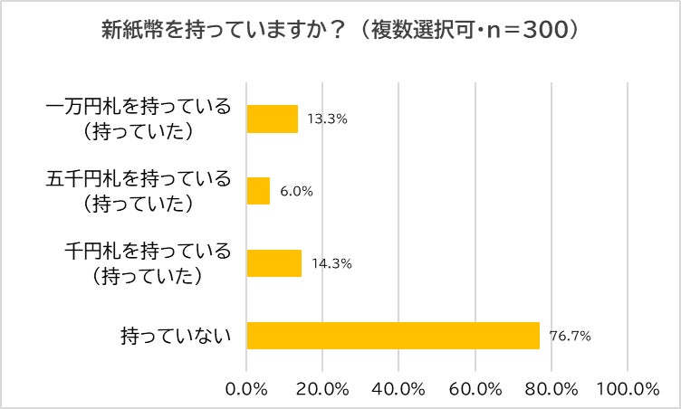 7月3日に新紙幣が発行されましたが、まだ十分に流通はしていないようです。そこで、「新紙幣を持っているか?」訊いたところ、8割弱(76.7%)が「持っていない」と回答し最多となりました。「千円札を持っている(持っていた)」(14.3%)と「一万円札を持っている(持っていた)」(13.3%)は1割超、「五千円札を持っている(持っていた)」は6.0%でした。