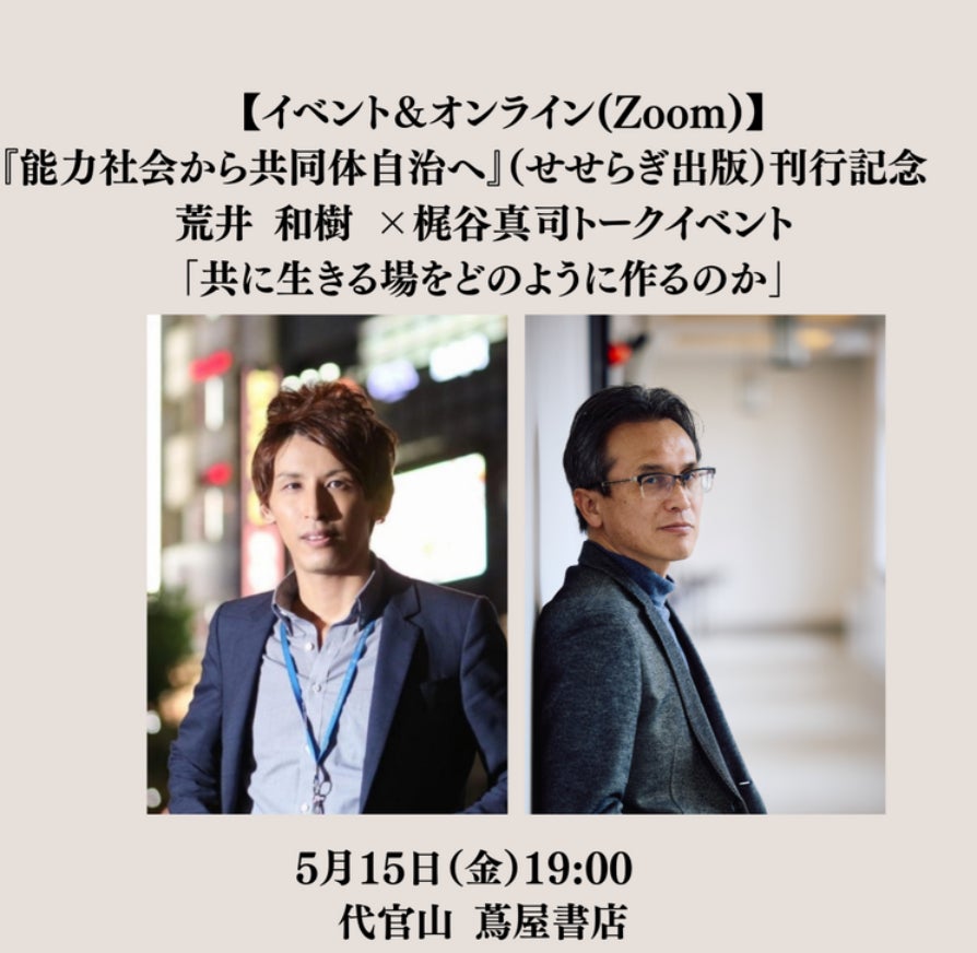 全国こども福祉センター理事長・荒井和樹の著書『能力社会から共同体自治へ』(せせらぎ出版)の刊行を記念し、2026年5月15日(金)に代官山 蔦屋書店にて、東京大学大学院総合文化研究科教授で哲学者の梶谷真司氏との対話イベントを開催します。