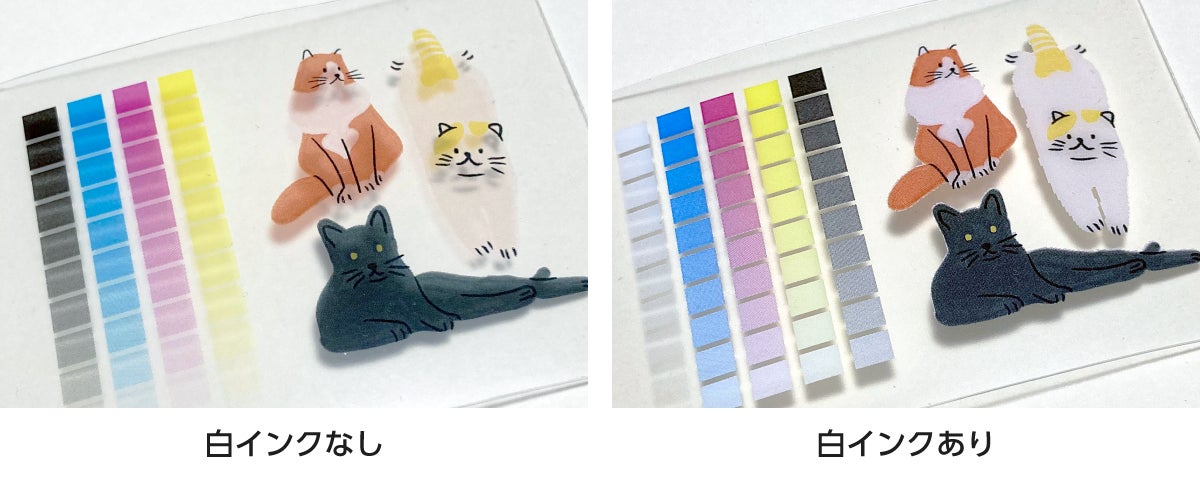 白インクを下地に印刷した場合、絵柄が目立ちやすく色鮮やかに表現され、白インクなしで印刷した場合、透明感のあるクリアな仕上がりとなります。