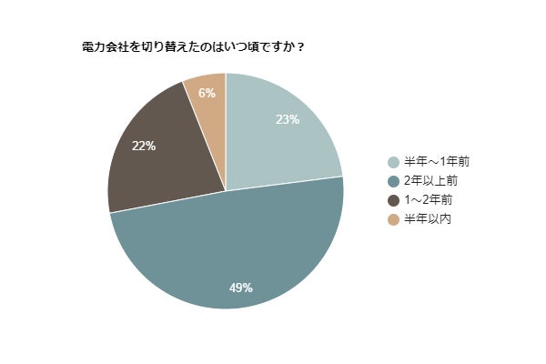 電力会社をいつ切り替えたかという質問に対しては、「2年以上前」と回答した方が49%でした。電力会社の切り替えを短い期間で行っている方は比較的少ないようです。