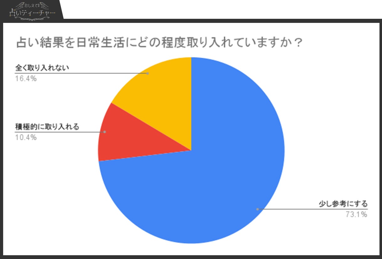 アンケート結果では、「少し参考にする」と回答した人が最も多く(73.1%)、占いを日常生活の軽い指針やアドバイスとして活用していることが分かりました。一方で、「積極的に取り入れる」層(10.4%)は占いを重要な意思決定ツールとして利用しており、「全く取り入れない」層(16.4%)は占いを必要と感じていないか信頼していない傾向が見られます。それぞれの層で占いへの関わり方が異なることが特徴です。